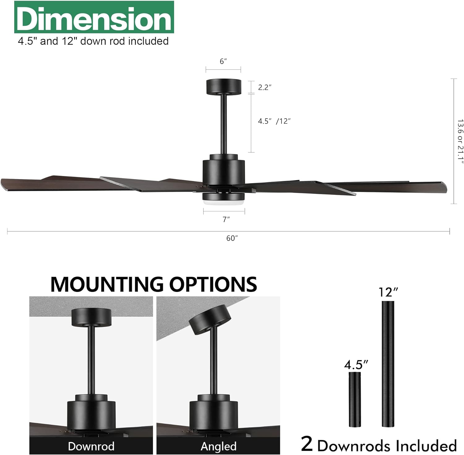 - INSTALL: Comes with 2 down rods (4.5” and 12” long) to match different ceiling heights.