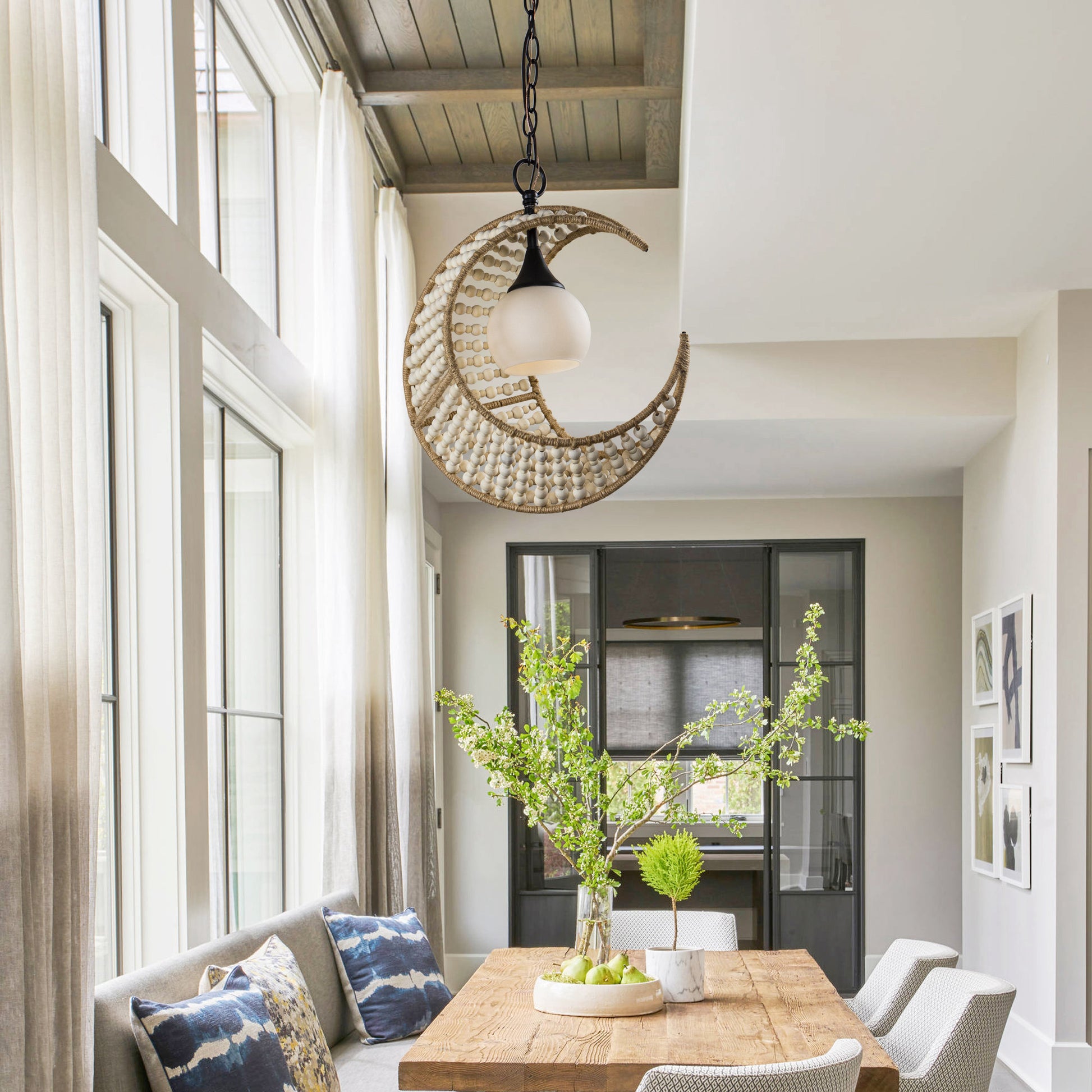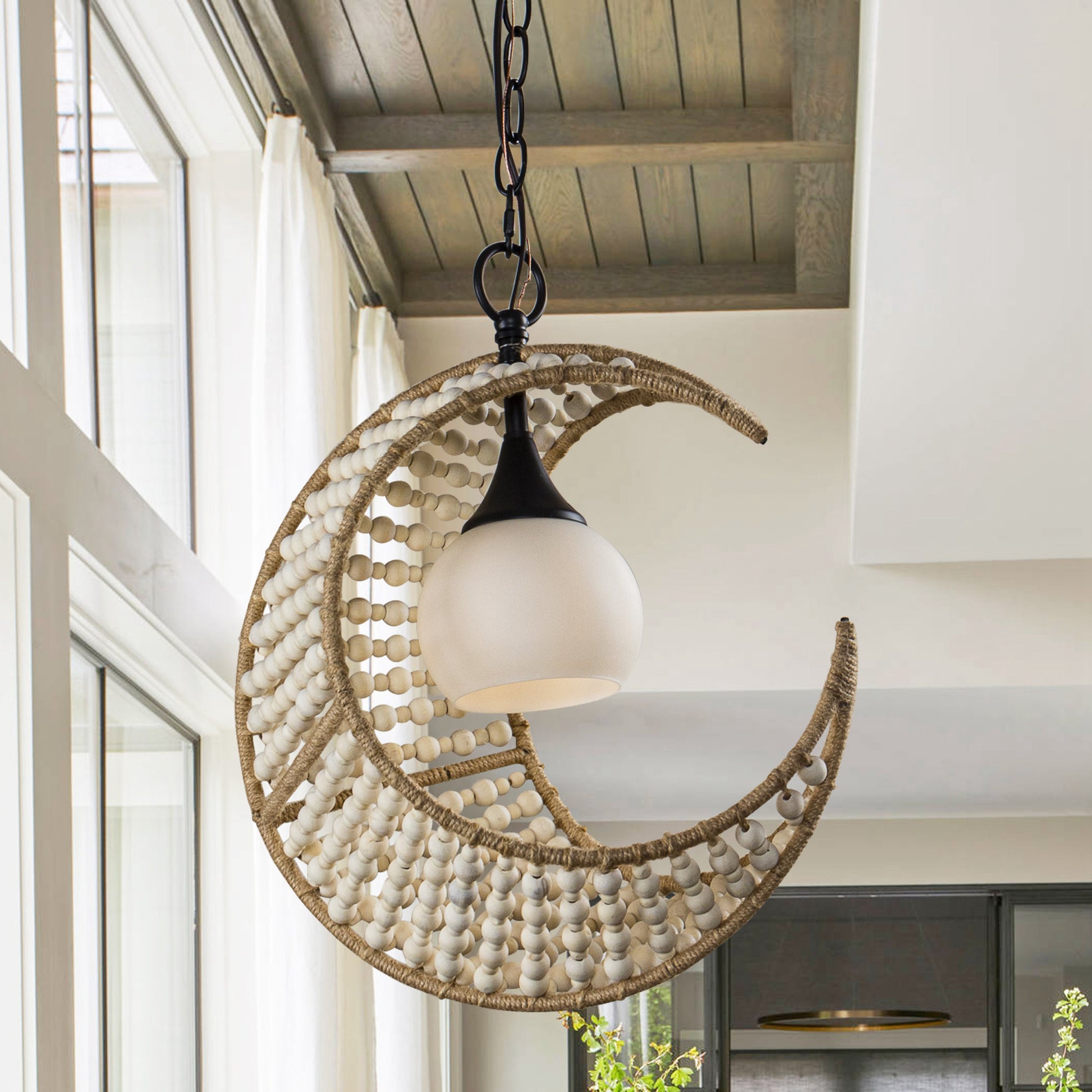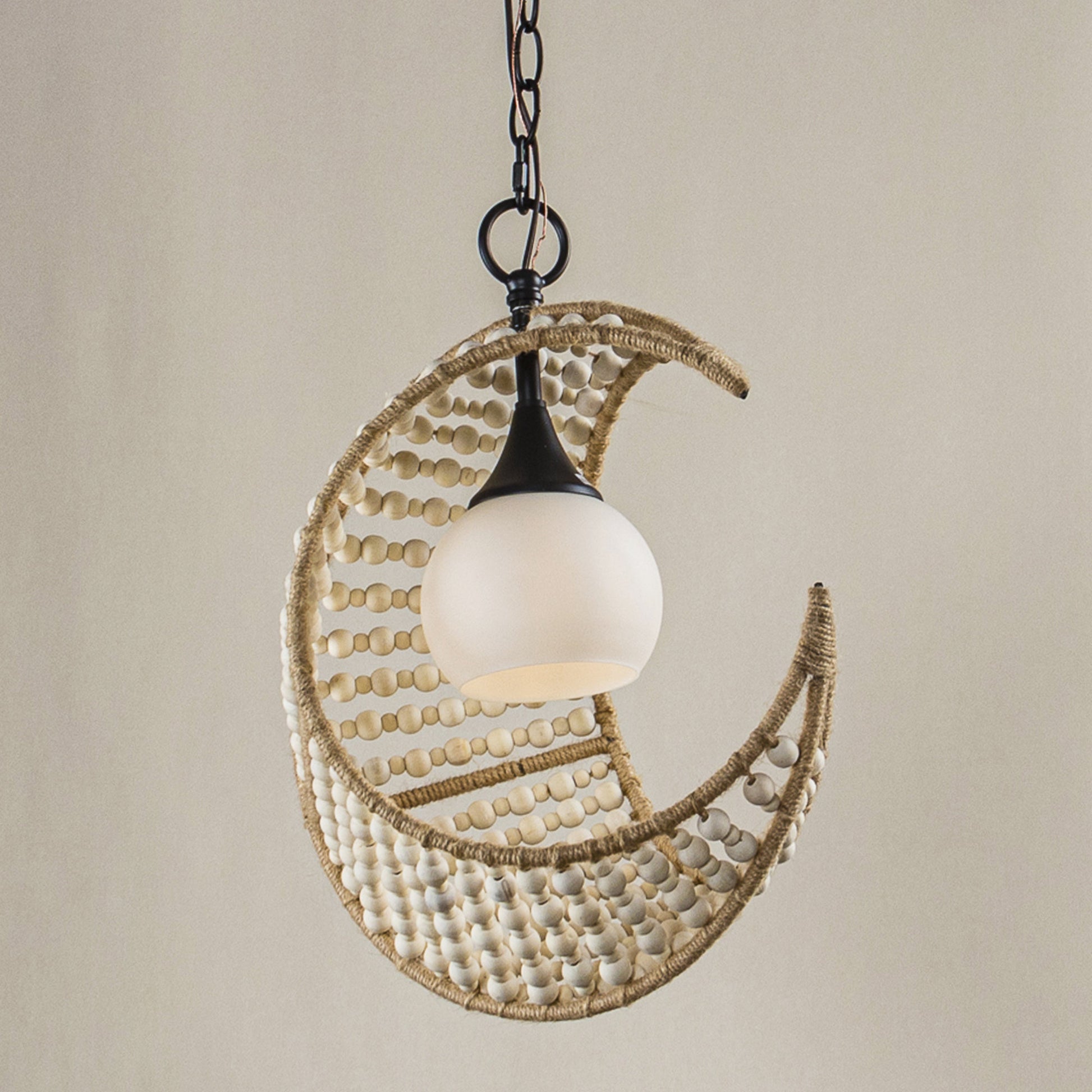 Lusteria 1-Light Wood Bead and Hemp Cresent Moon Pendant Lighting