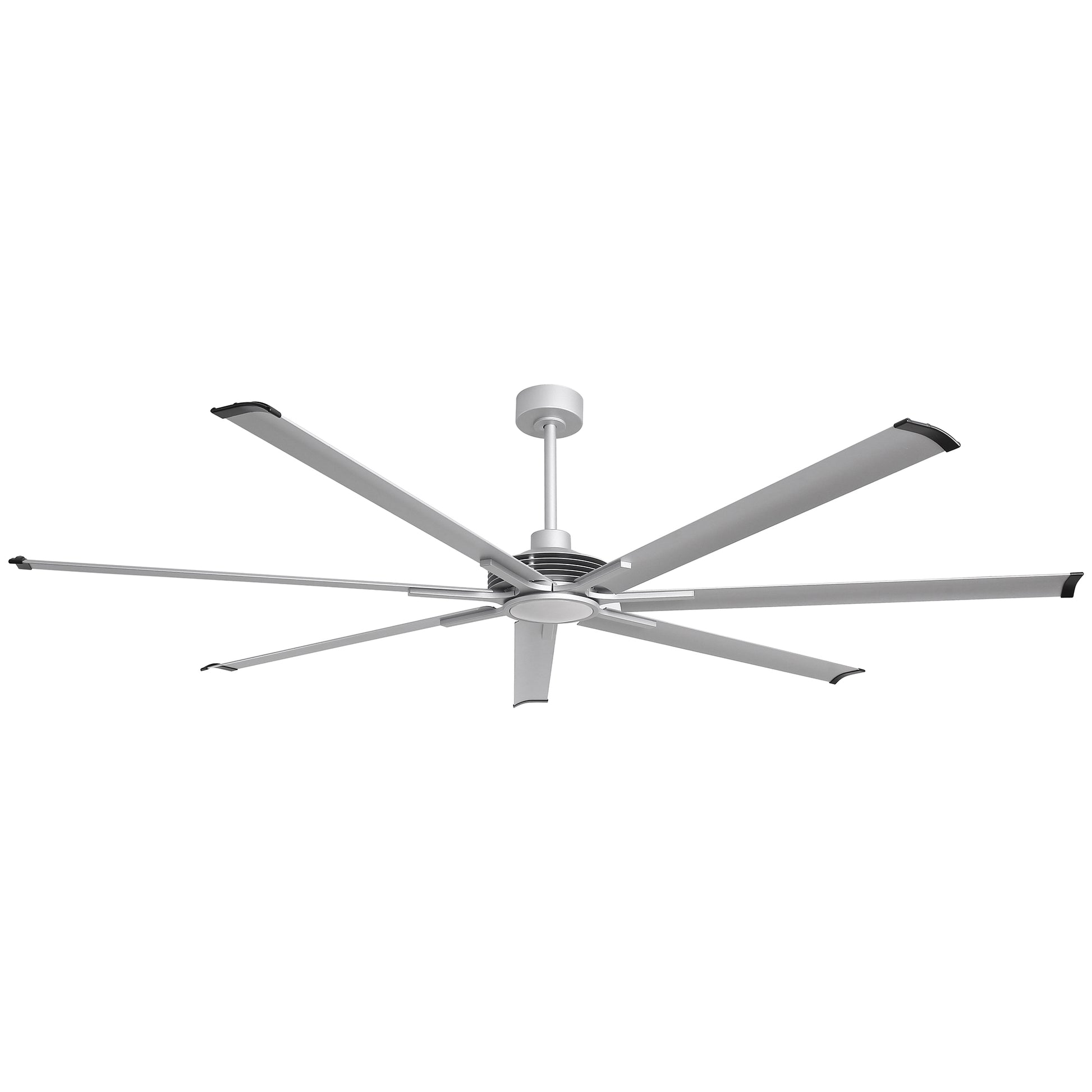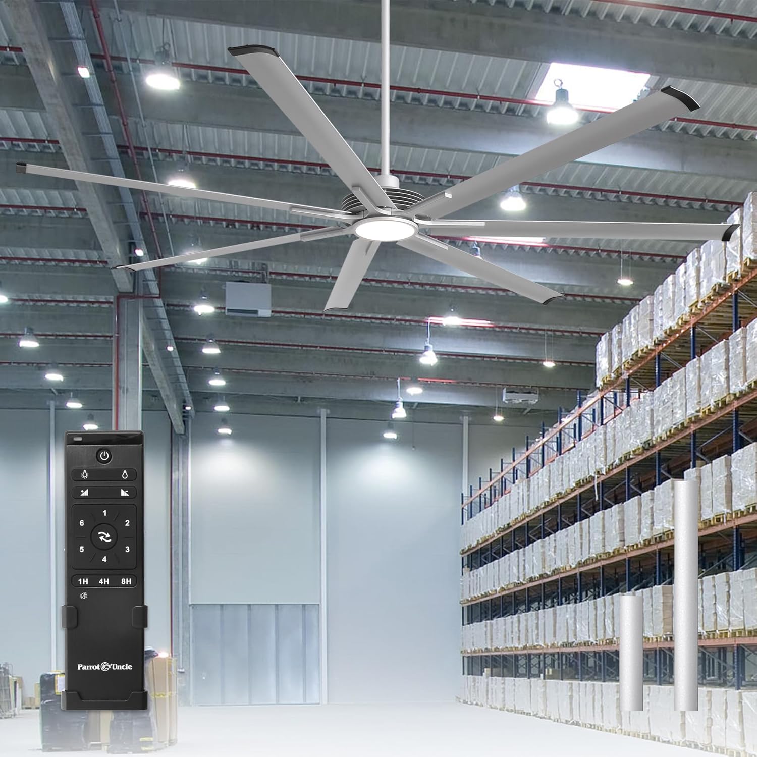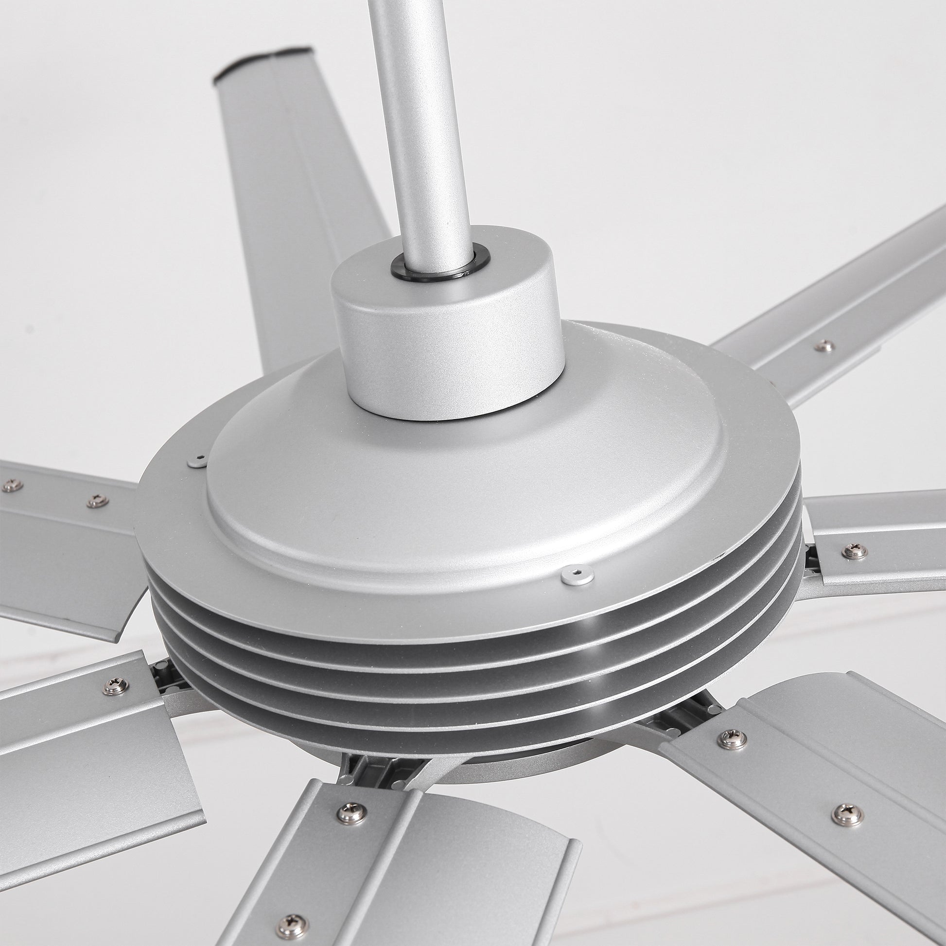 Experience comfort and performance with this Industrial Ceiling Fan, featuring a 100" modern silver design, reversible DC motor, and integrated dimmable LED light. With 7 aerodynamic aluminum blades, this fan delivers powerful airflow and quiet operation, ideal for large rooms, patios, or open living spaces.