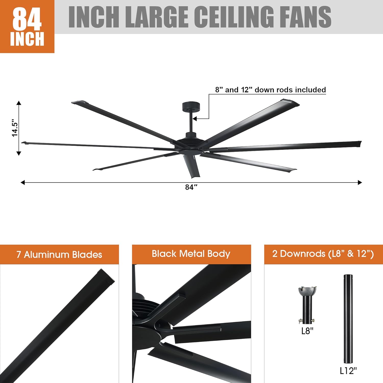 Enjoy powerful, quiet comfort with this Ceiling Fan featuring an 84" modern industrial design, 7 black metal blades, and a high-efficiency reversible DC motor. Perfect for large indoor or covered outdoor spaces, this fan combines minimalist style with exceptional airflow and whisper-quiet operation.