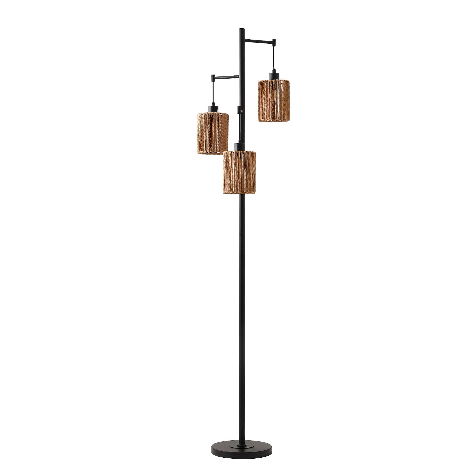 Bring warmth and texture to your home with this Floor Lamp featuring three handwoven hemp shades suspended from a sleek black metal frame. Each shade diffuses a gentle, golden glow—perfect for creating a cozy, inviting atmosphere in living rooms, bedrooms, or reading nooks. The natural fibers and classic black finish blend rustic charm with modern simplicity, making it a versatile statement piece for any décor.