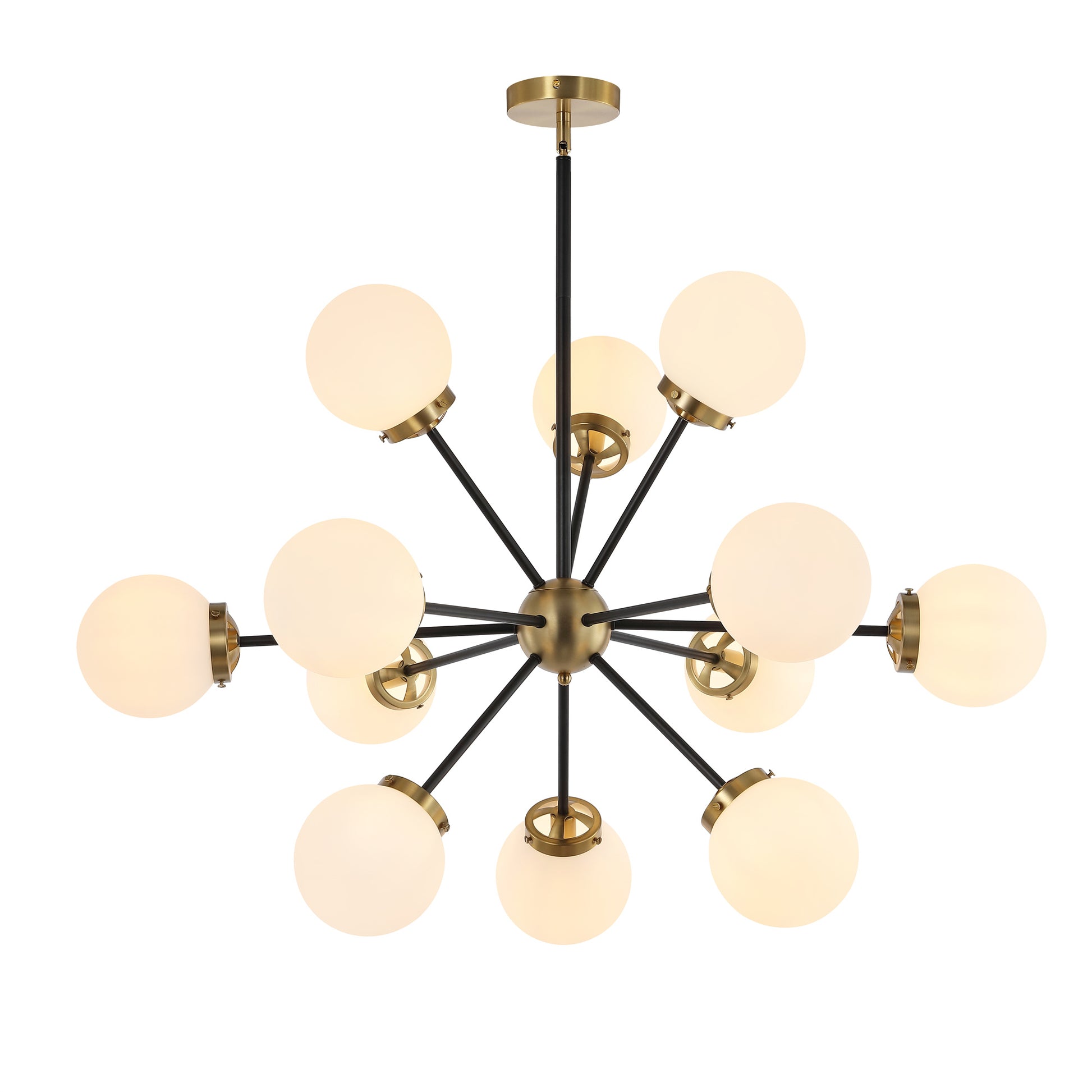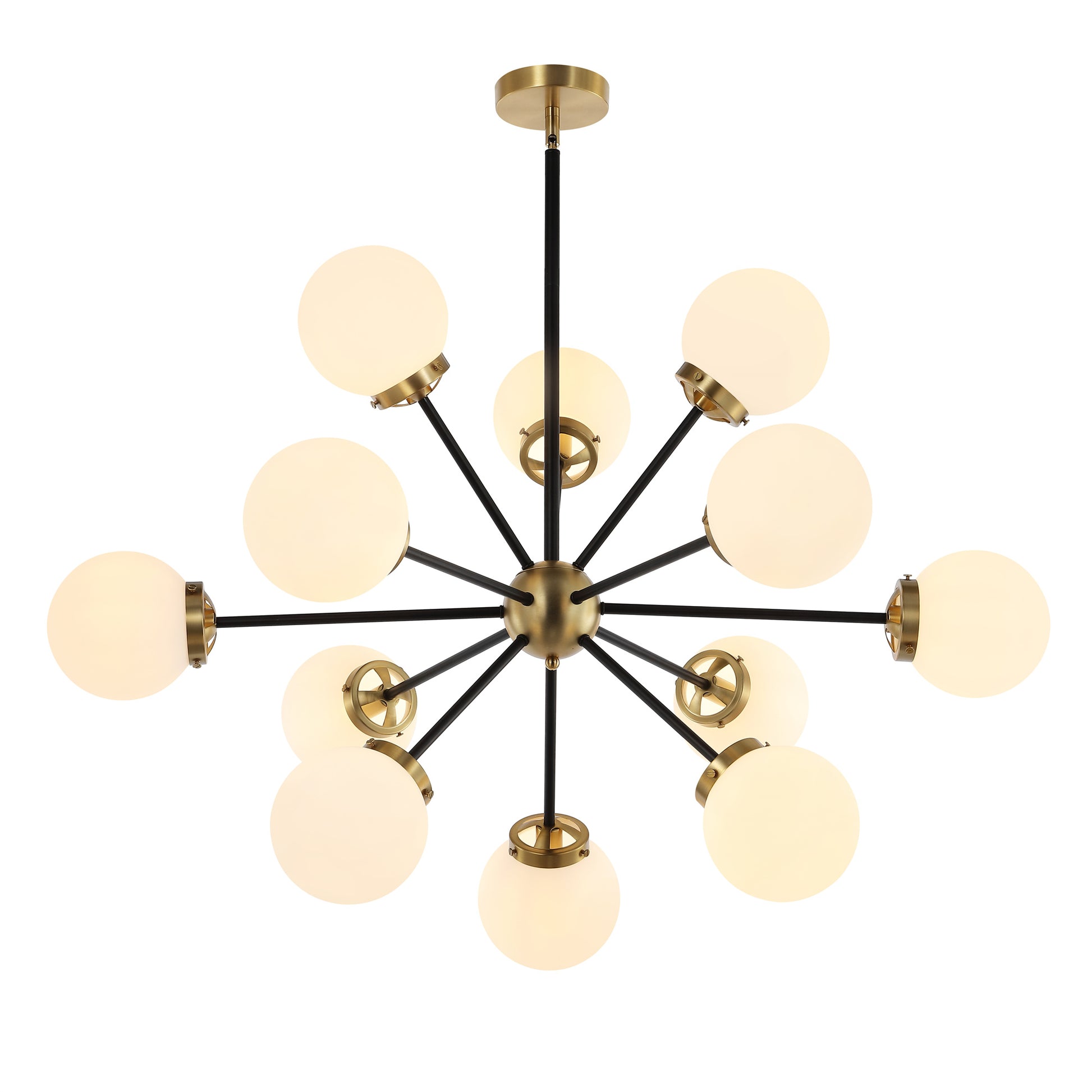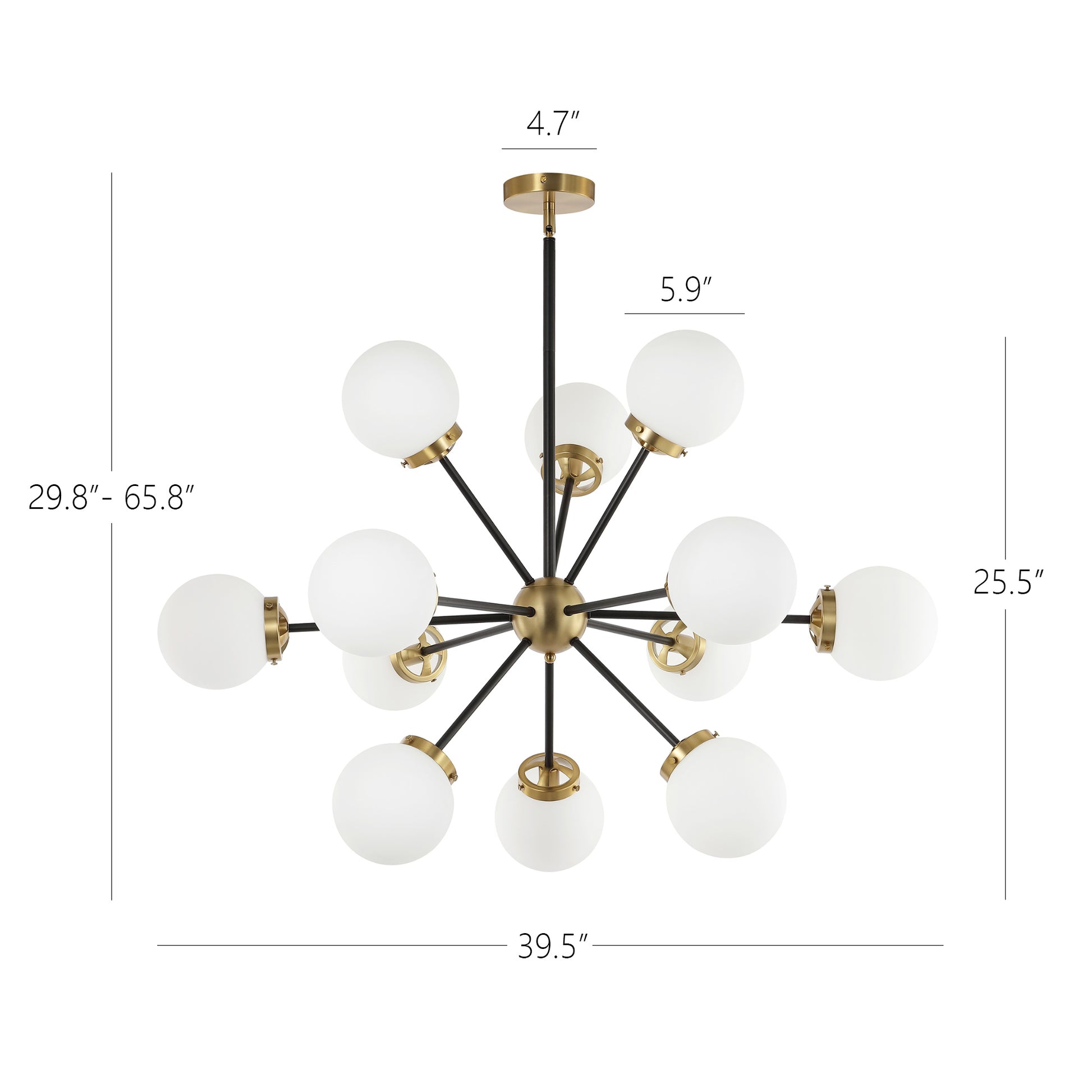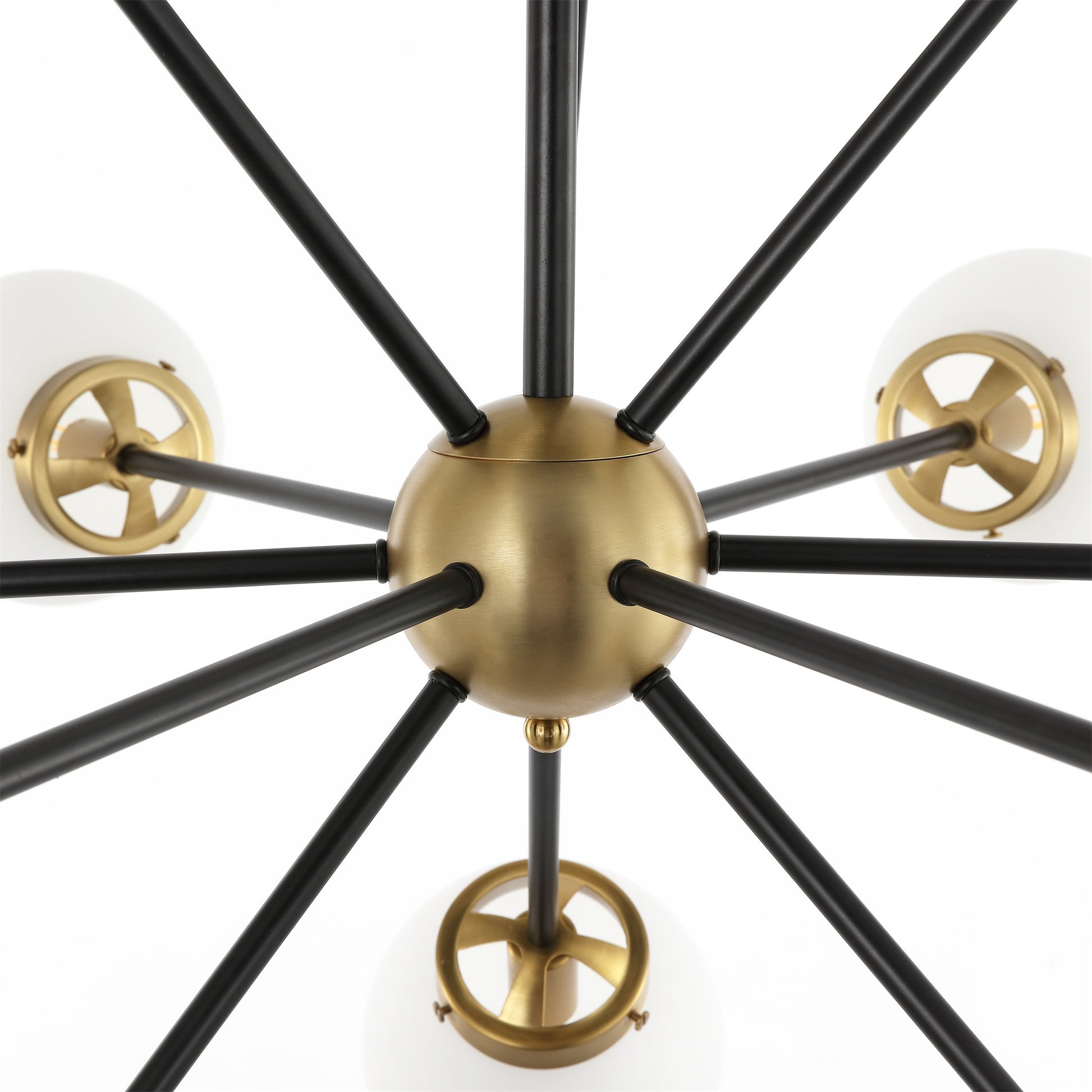Make a bold statement with this Modern Sputnik Chandelier, featuring a black and brass metal frame, twelve opal glass globe shades, and an adjustable height design. This sleek mid-century modern light fixture brings timeless sophistication and balanced geometry to dining rooms, living areas, or entryways.
