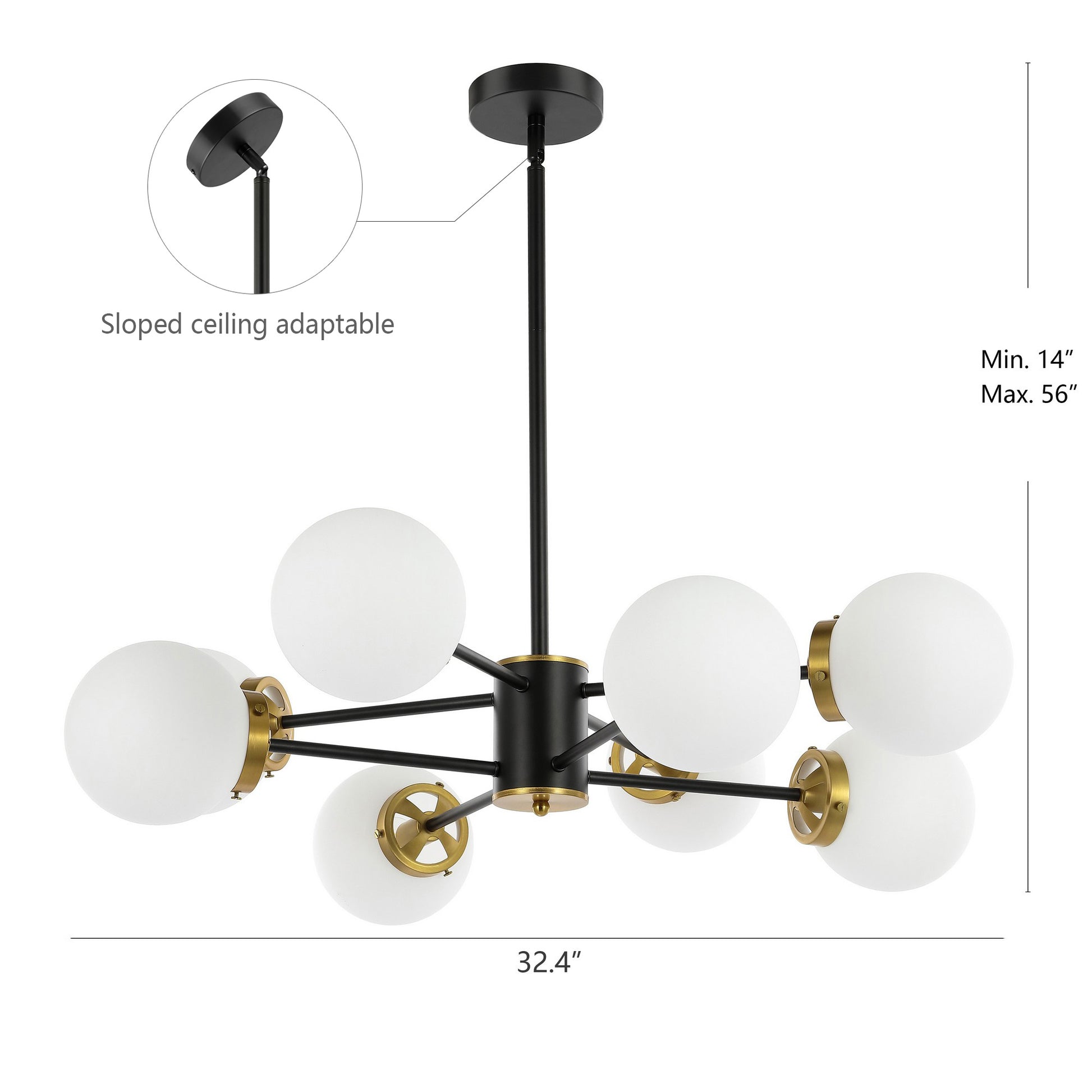 Make a bold statement with this Modern Sputnik Chandelier, featuring a black and brass metal frame, eight opal glass globe shades, and an adjustable height design. This sleek mid-century modern light fixture brings timeless sophistication and balanced geometry to dining rooms, living areas, or entryways.