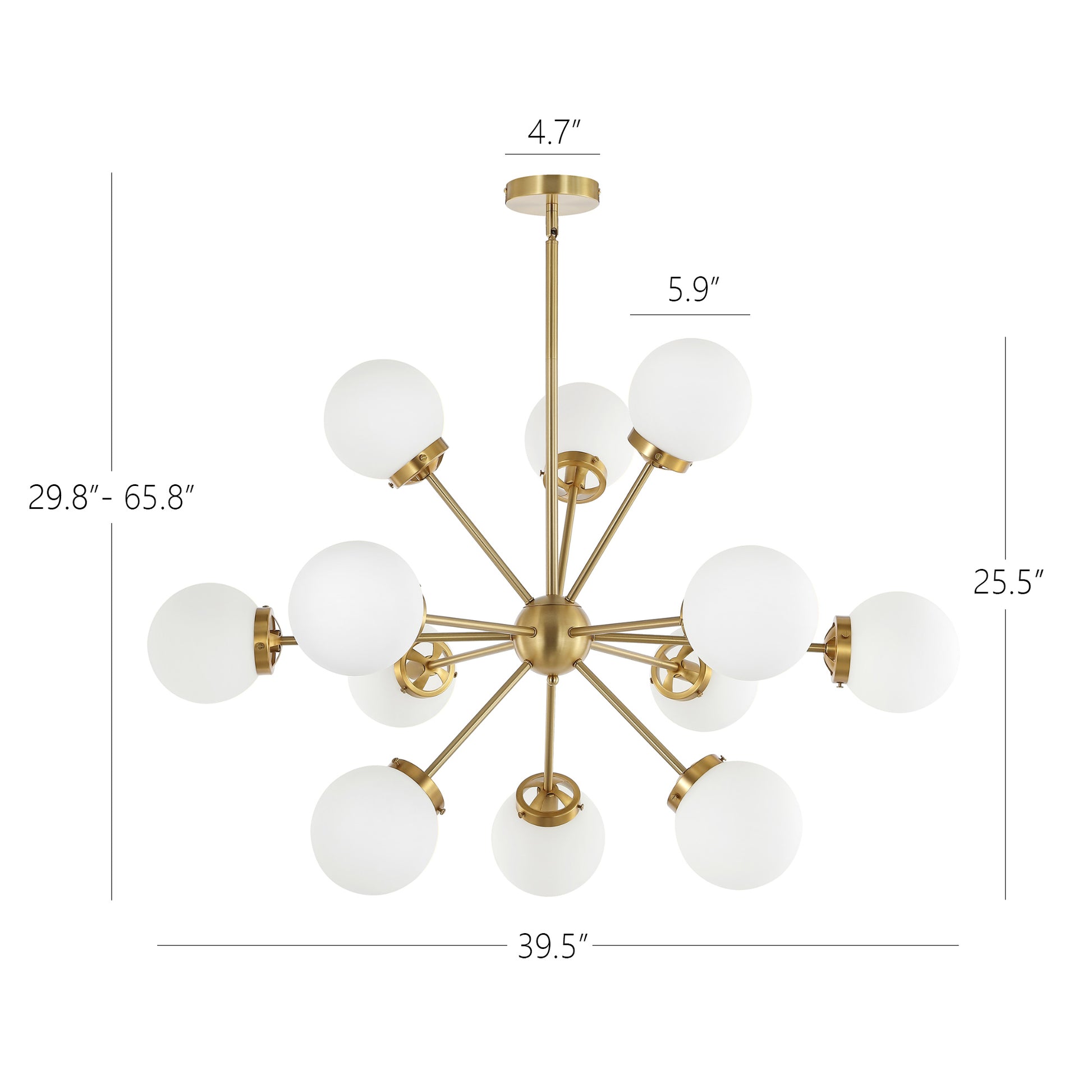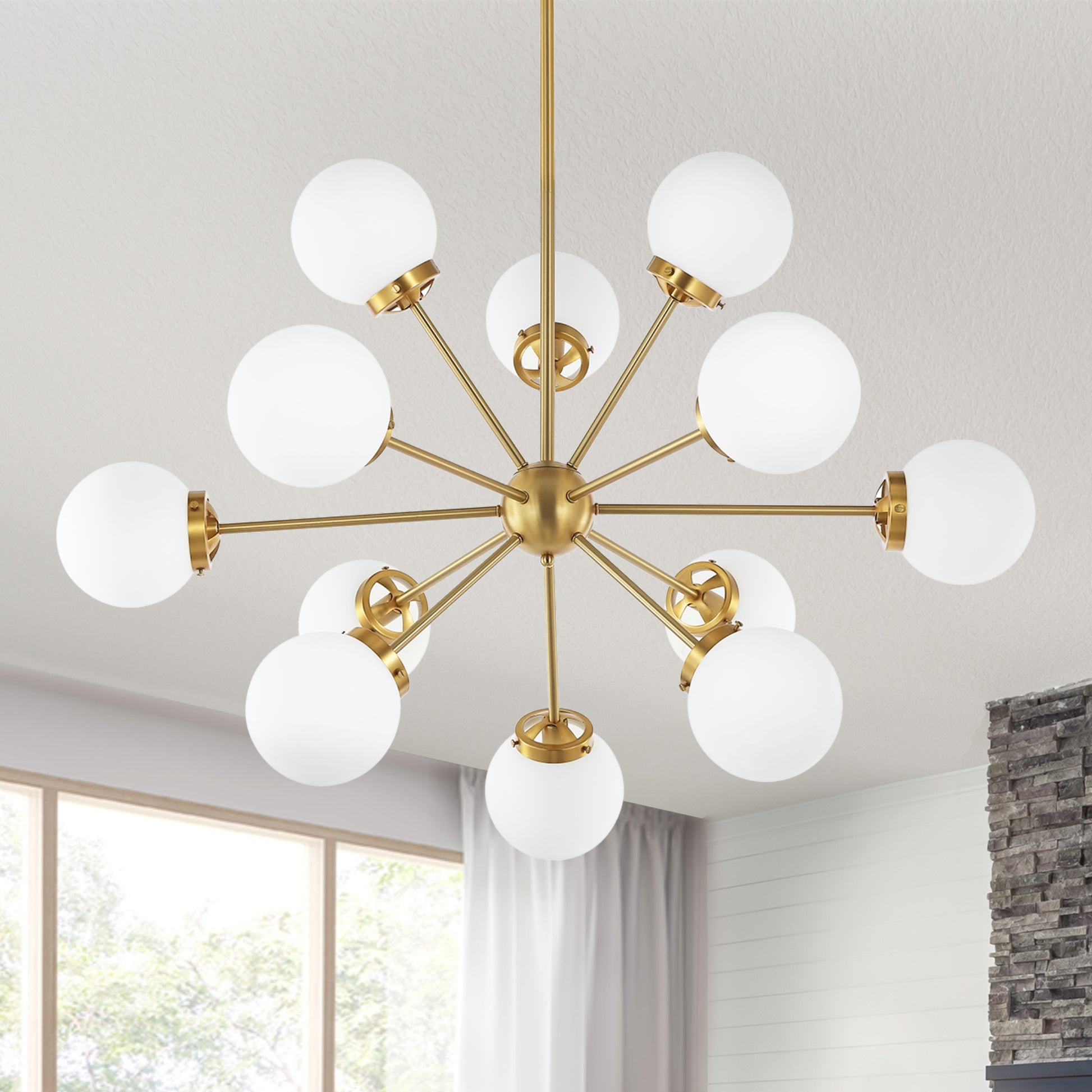 Make a bold statement with this Modern Sputnik Chandelier, featuring a brass metal frame, twelve opal glass globe shades, and an adjustable height design. This sleek mid-century modern light fixture brings timeless sophistication and balanced geometry to dining rooms, living areas, or entryways.