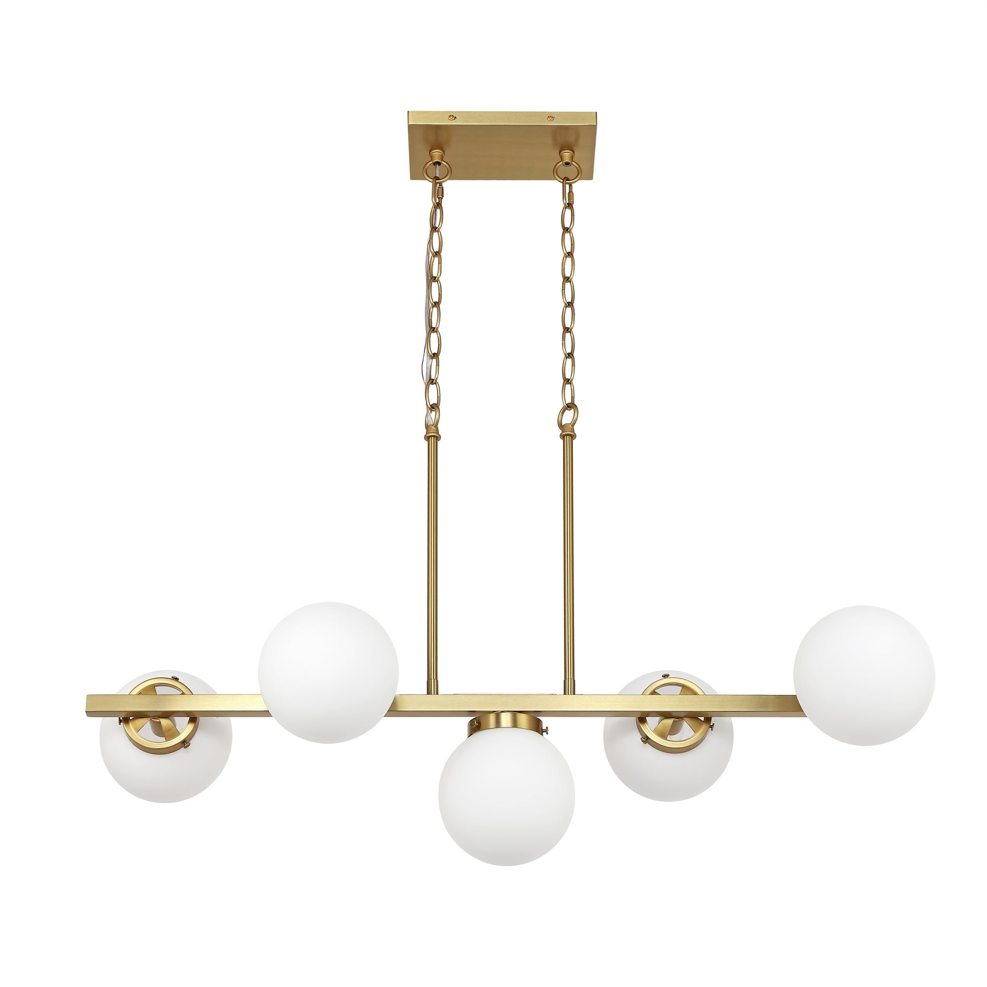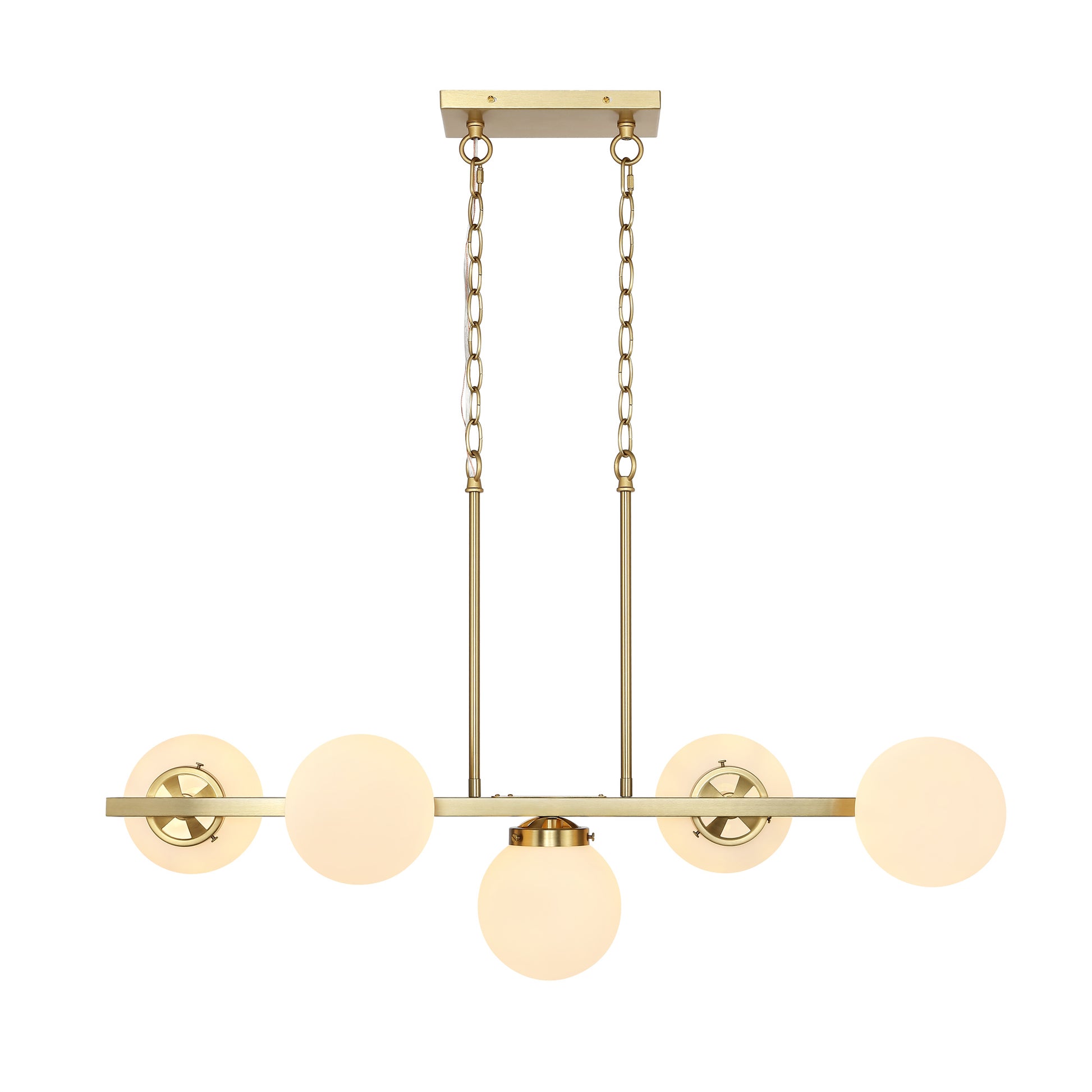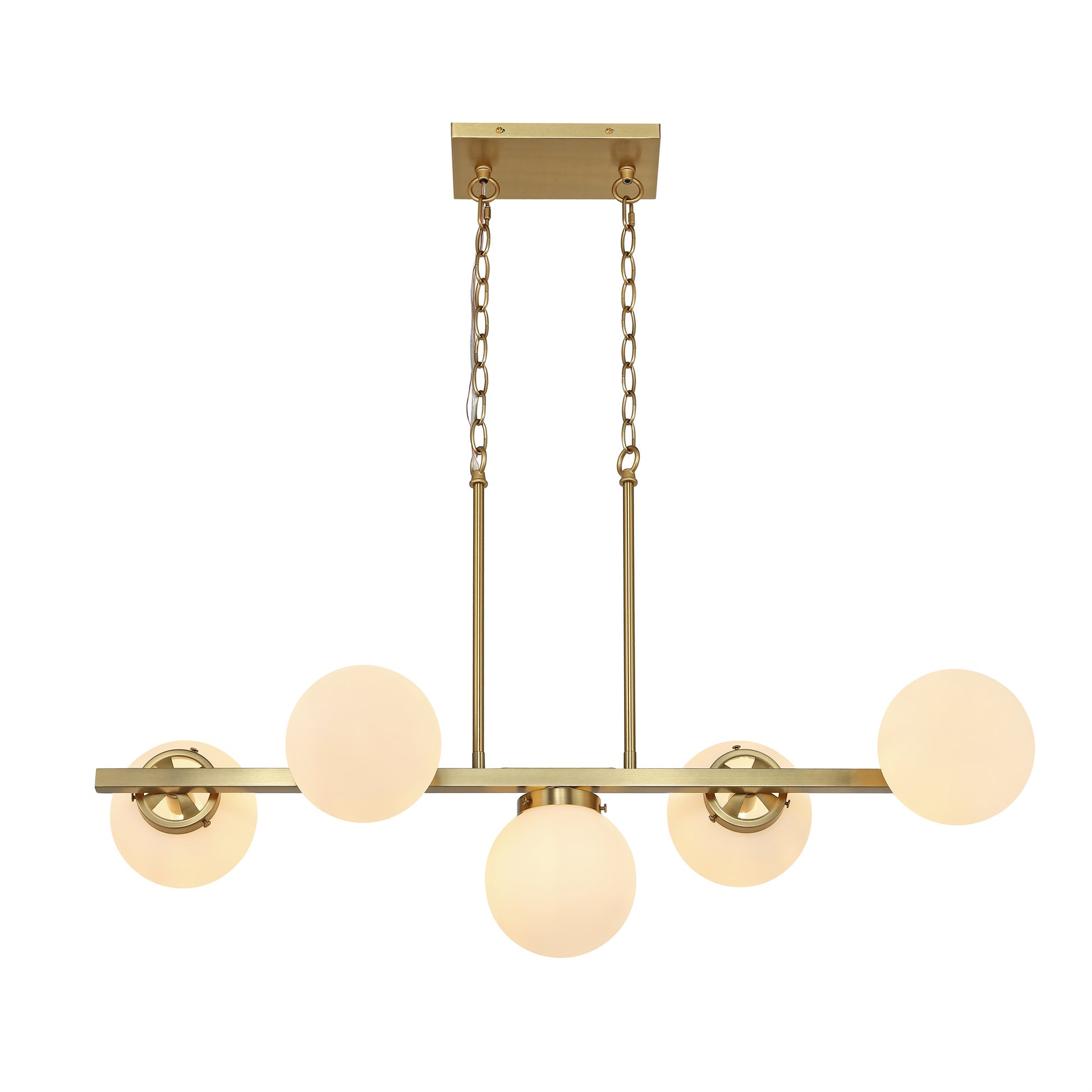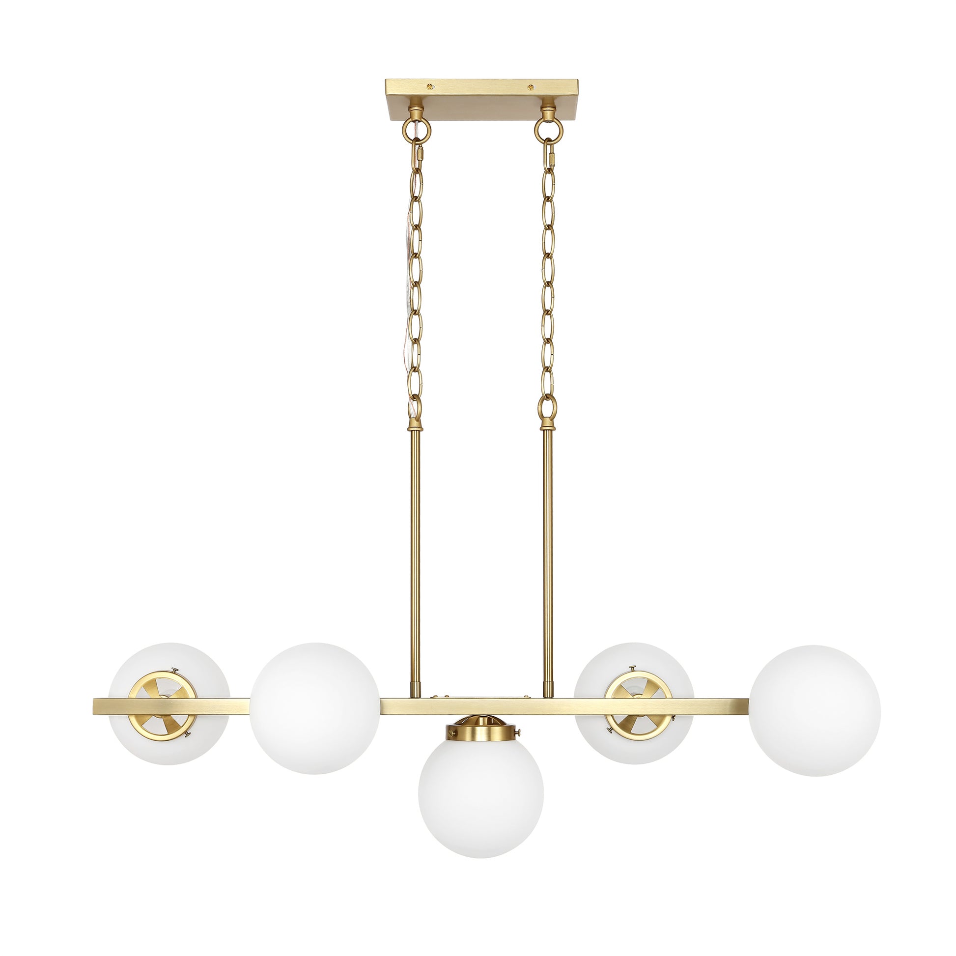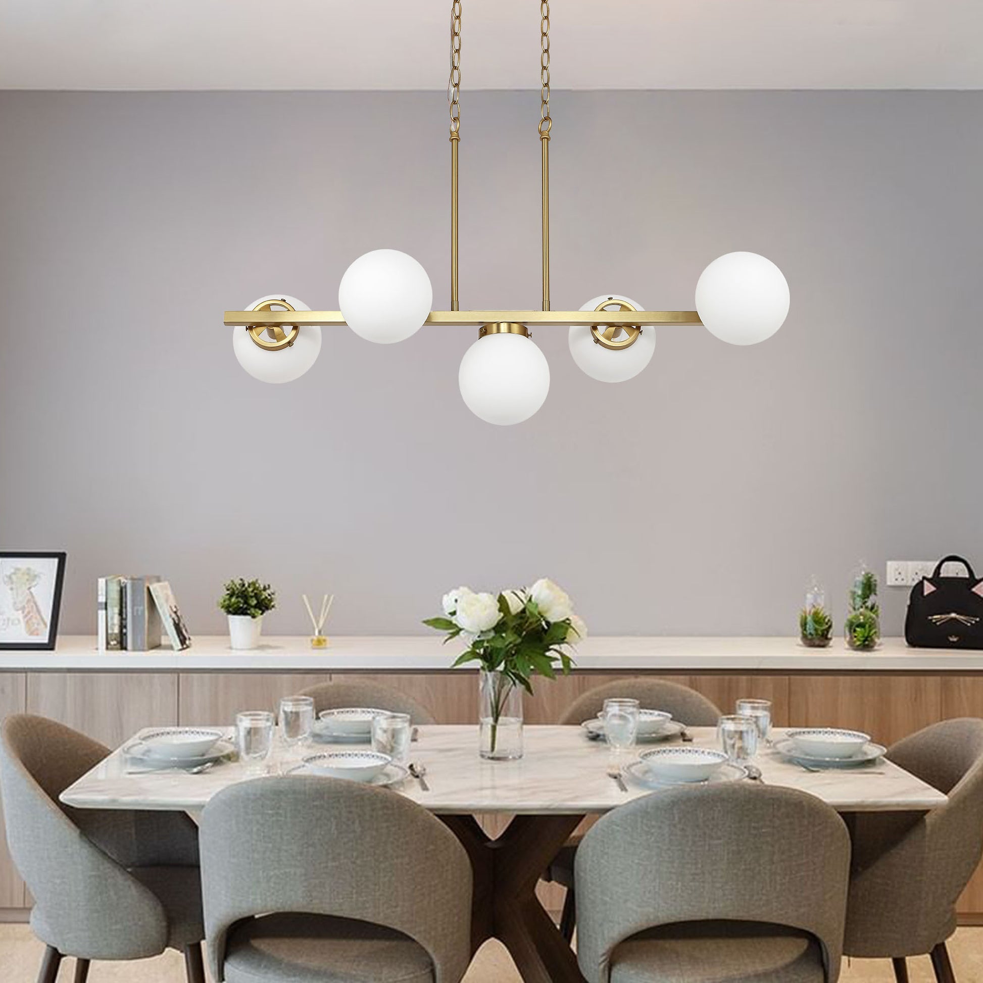 Make a bold statement with this Modern Sputnik Chandelier, featuring a brass metal frame, five opal glass globe shades, and an adjustable height design. This sleek mid-century modern light fixture brings timeless sophistication and balanced geometry to dining rooms, living areas, or entryways.