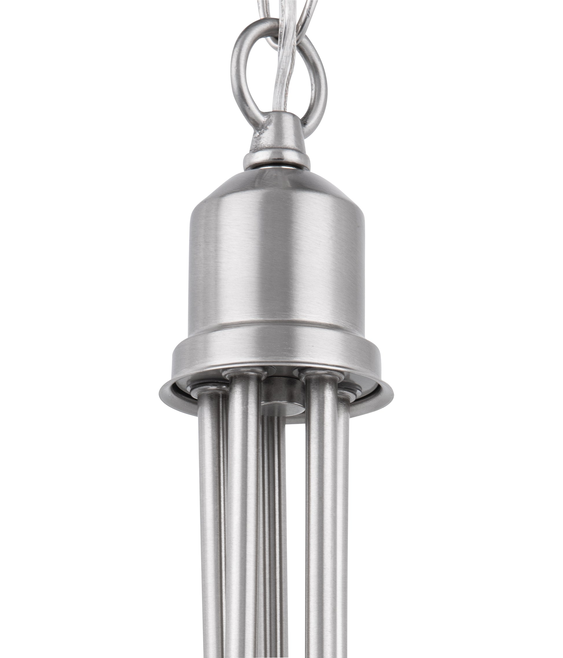 Quintuple Fish Hook Style Lamp, This stainless silver quintuple (5) light pendant finished in an elegant stainless and silver that works well with traditional designs. Each of the five lights have a clear glass shade. Each light can hold a 60W bulb, which is not included. Best of all, this light is compatible with a dimmer switch (not included), you can adjust the dimmer switch to get the precise lighting that you want for the area.
