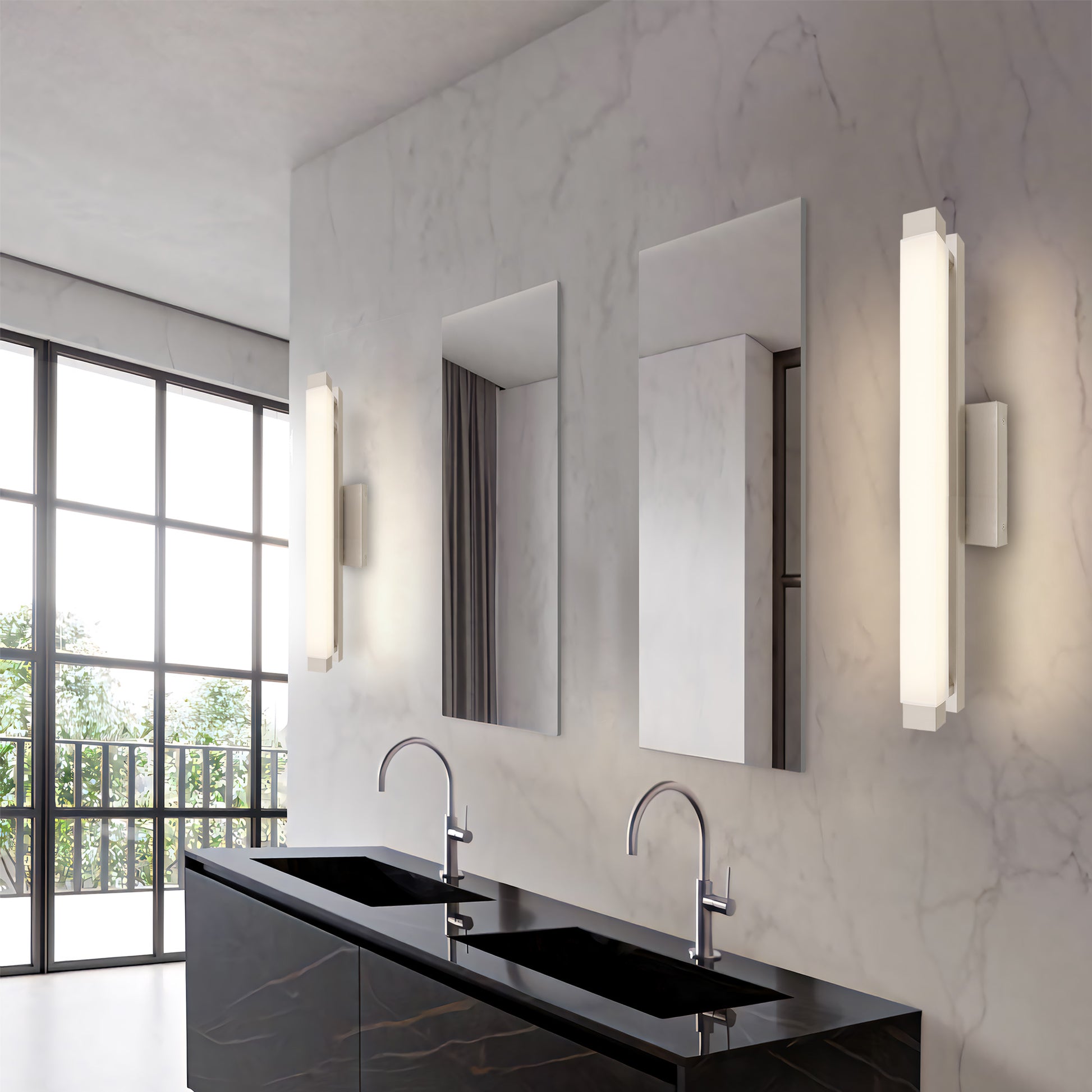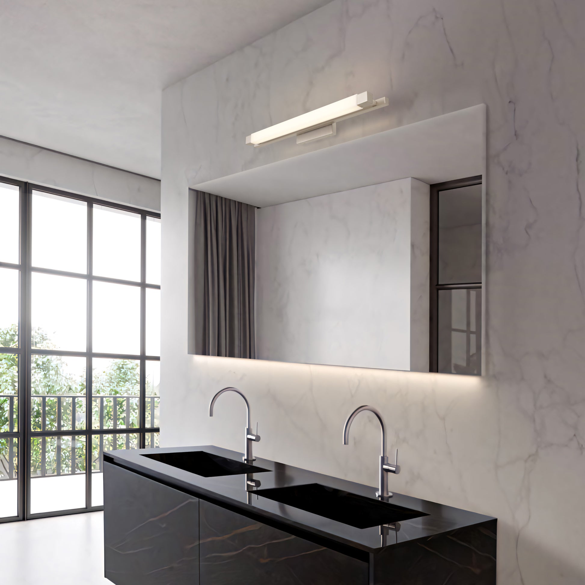 Where craftsmanship meets quiet luxury. The Albion Collection brings sleek silhouettes and soft radiance together in a design that feels both modern and timeless. An opal rectangular shade diffuses a gentle LED glow, complemented by finely crafted metallic accents that speak to its elevated quality. Whether mounted vertically beside your mirror or horizontally above it, this versatile bath bar offers flattering, ambient light—perfect for daily rituals or unwinding in style.